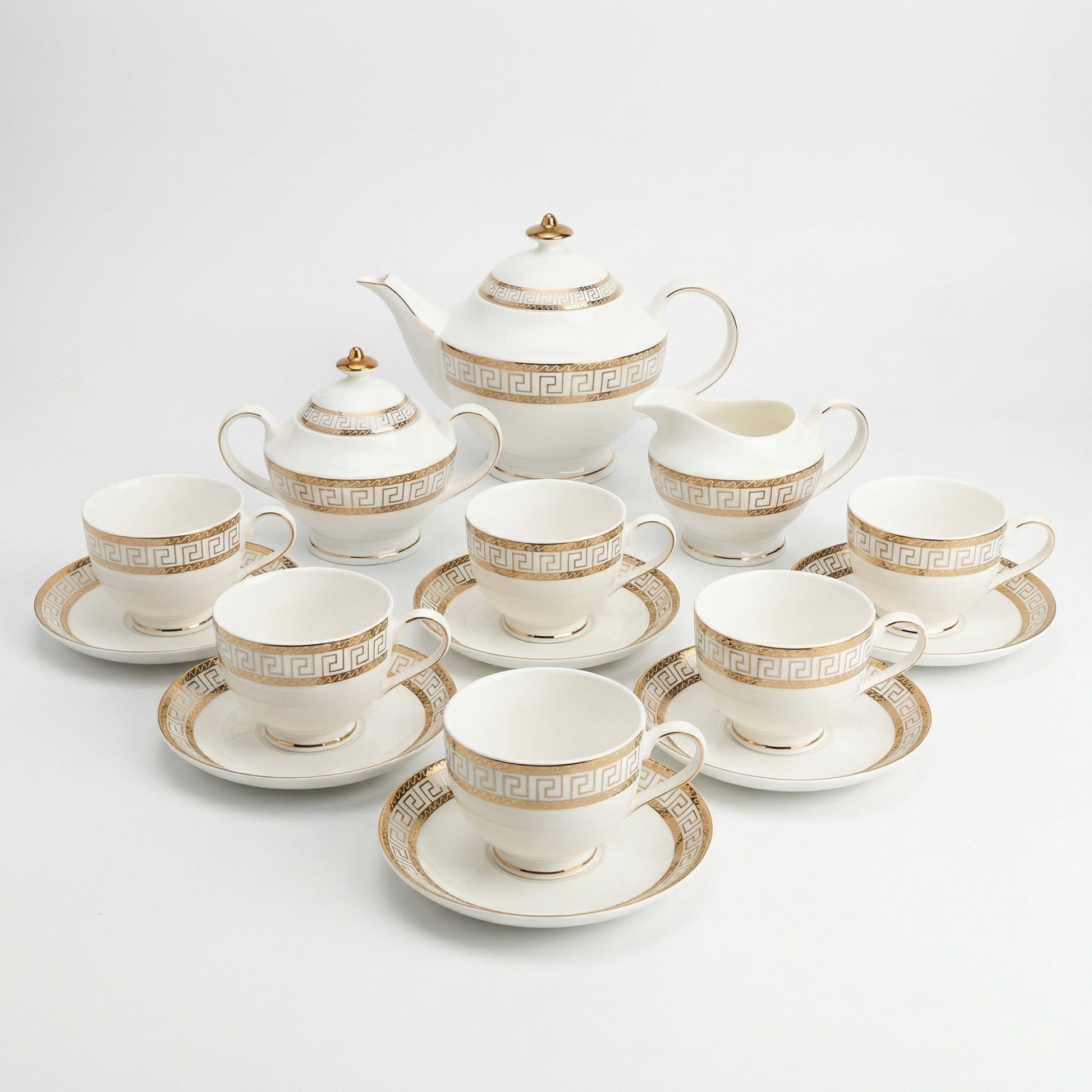 Heritage Gold is a fine bone china tea set with a calm, architectural look, an ivory body framed by a crisp geometric border and finished with 22k gold detailing. It’s the kind of set that feels instantly considered: clean, balanced, and quietly impressive on the table.