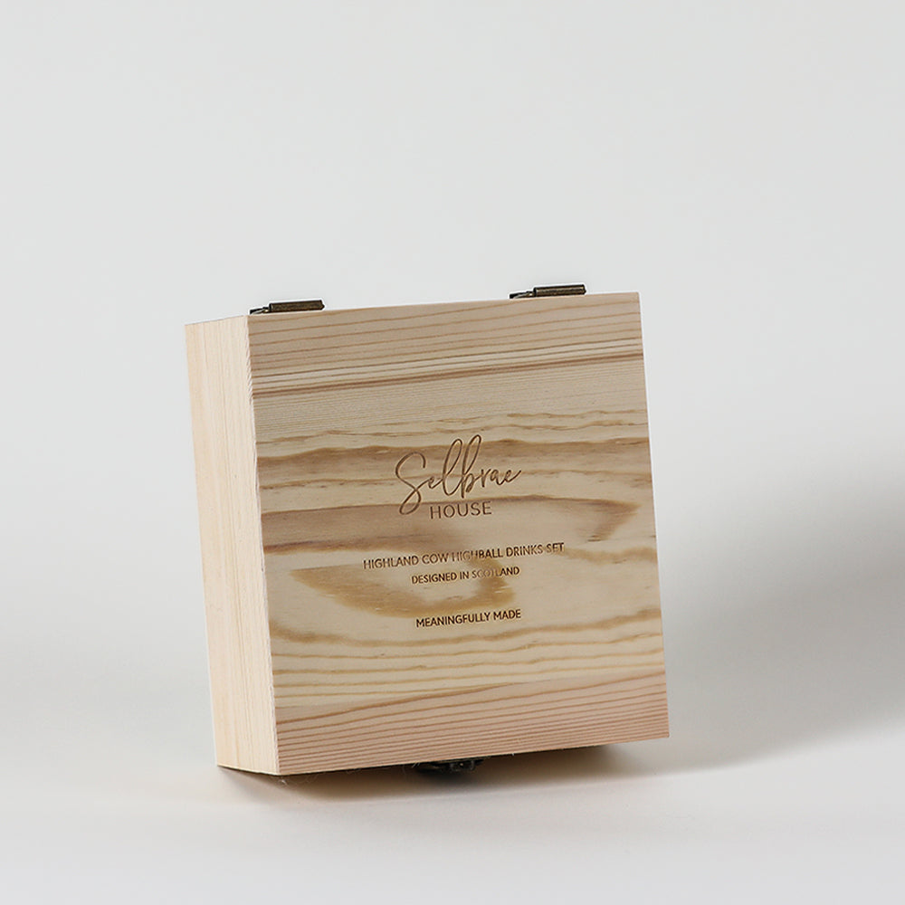 Transport yourself to the serene landscapes of the Scottish Highlands with our Highland Cow-themed Highball Drinks Set. This set features a highball glass, slate coaster, drinks stirrer, and drinks tipper, all adorned with a highland cow design. Ideal for those who admire the charm of Highland cows, this set is presented in a stylish Selbrae House wooden box, making it a sophisticated gift for Highland cow enthusiasts.