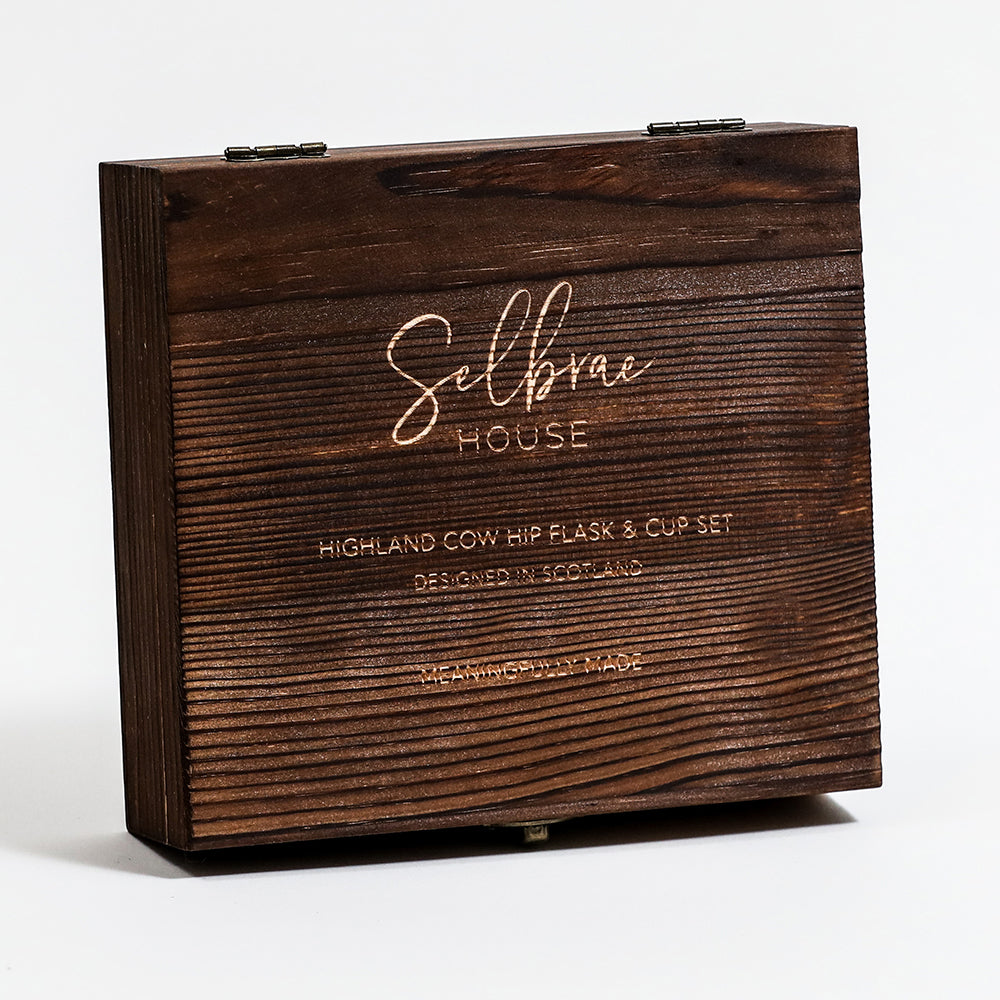 Add a touch of Scottish charm to your drinking rituals with our Hip Flask & Cup set, showcasing a delightful Highland Cow engraving on the flask and each cup. This set is perfect for those who appreciate traditional Scottish symbols and a good dram. Housed in a wooden Selbrae House gift box, this set makes for a meaningful and stylish gift for anyone with a fondness for Highland cows or Scottish culture.