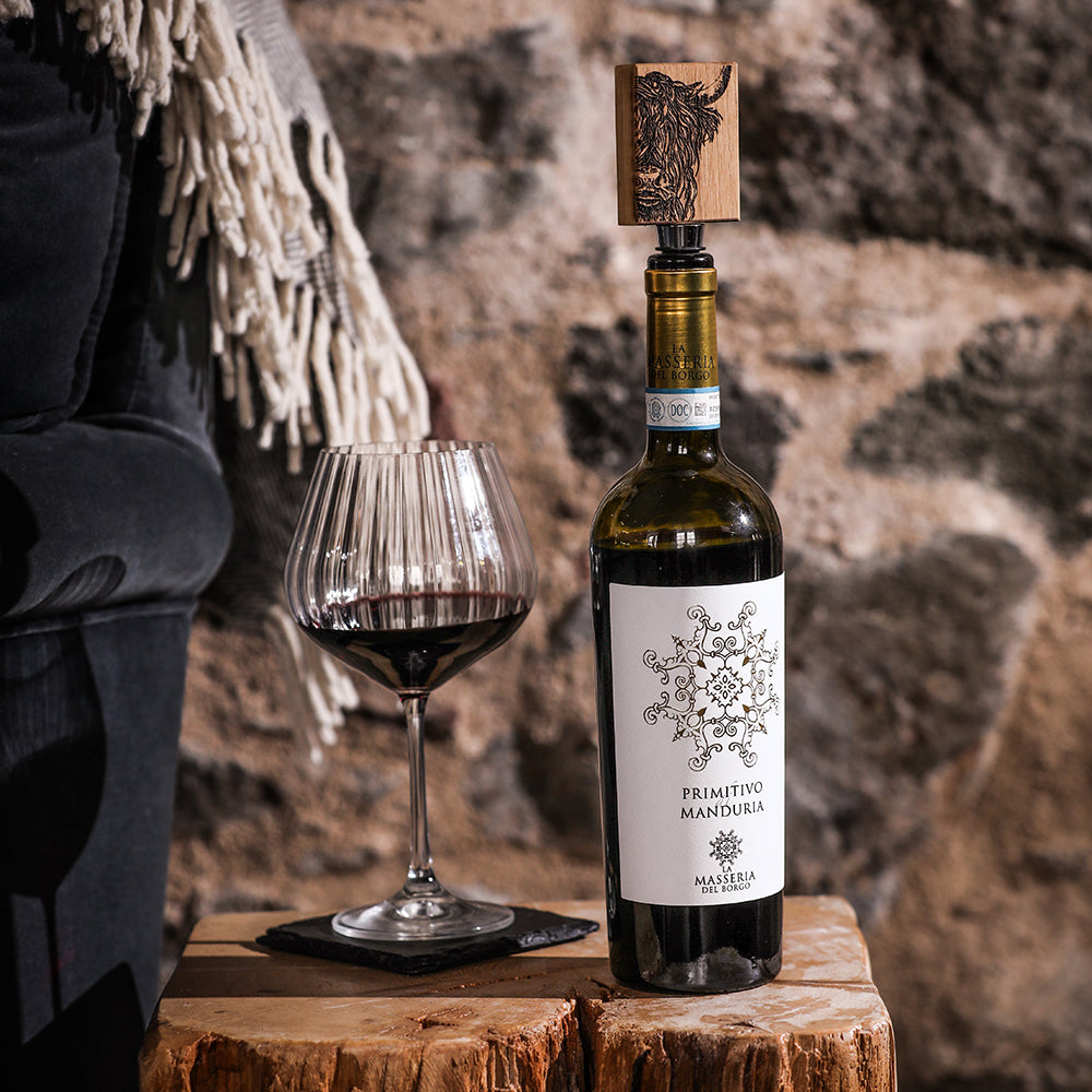 Add a touch of Scottish flair to your wine collection with this beautifully engraved Highland cow oak bottle stopper, sustainably made from British oak for a charming addition to your barware.