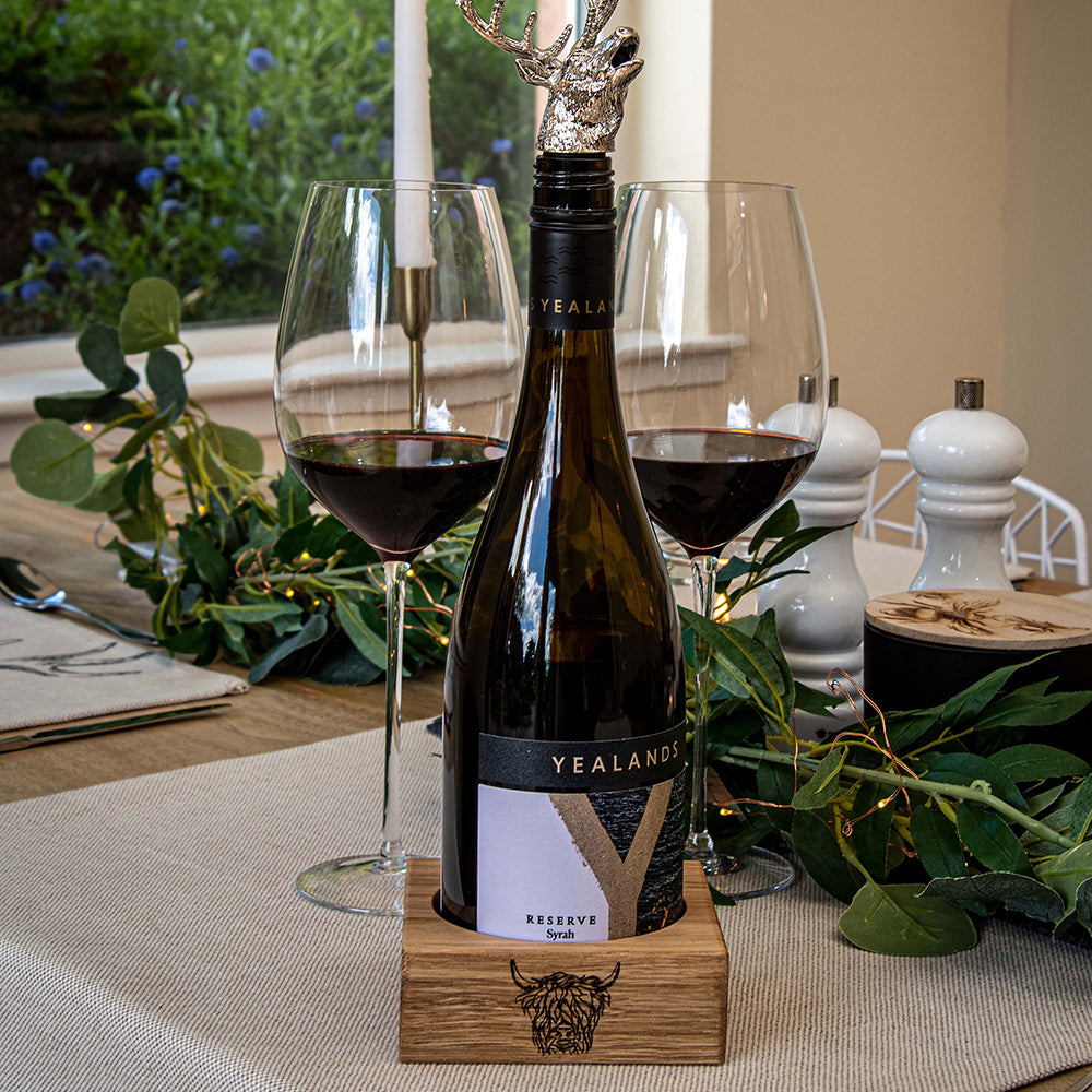Set your wine bottle in style on this beautifully engraved Highland cow-shaped oak wine bottle coaster, a charming addition to your table setting sustainably made from British oak.