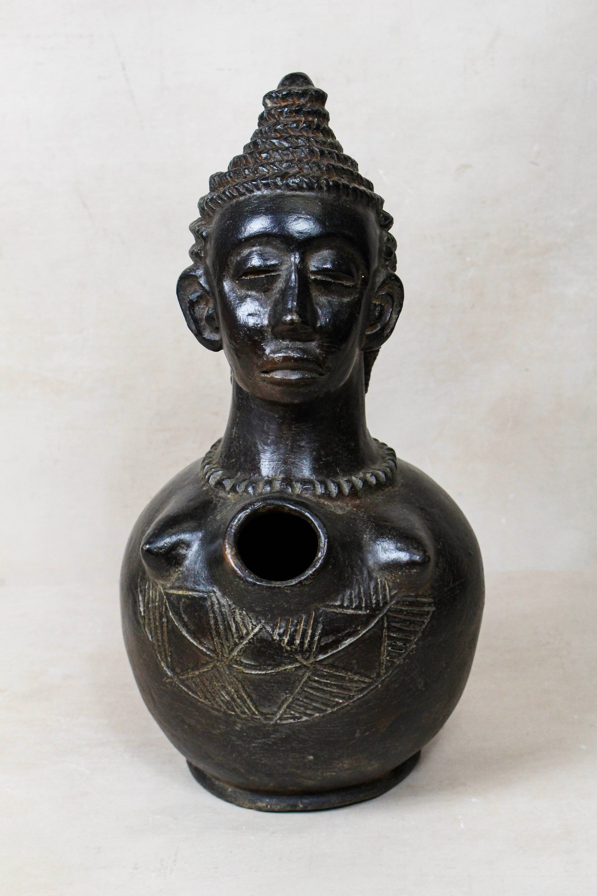 This exquisite Mangbetu Bust Vase is a striking marriage of functional pottery and sculptural artistry, originating from the Democratic Republic of the Congo. A true conversation piece for any curated home, it embodies the "beauty of the soul" that defines central African prestige art.