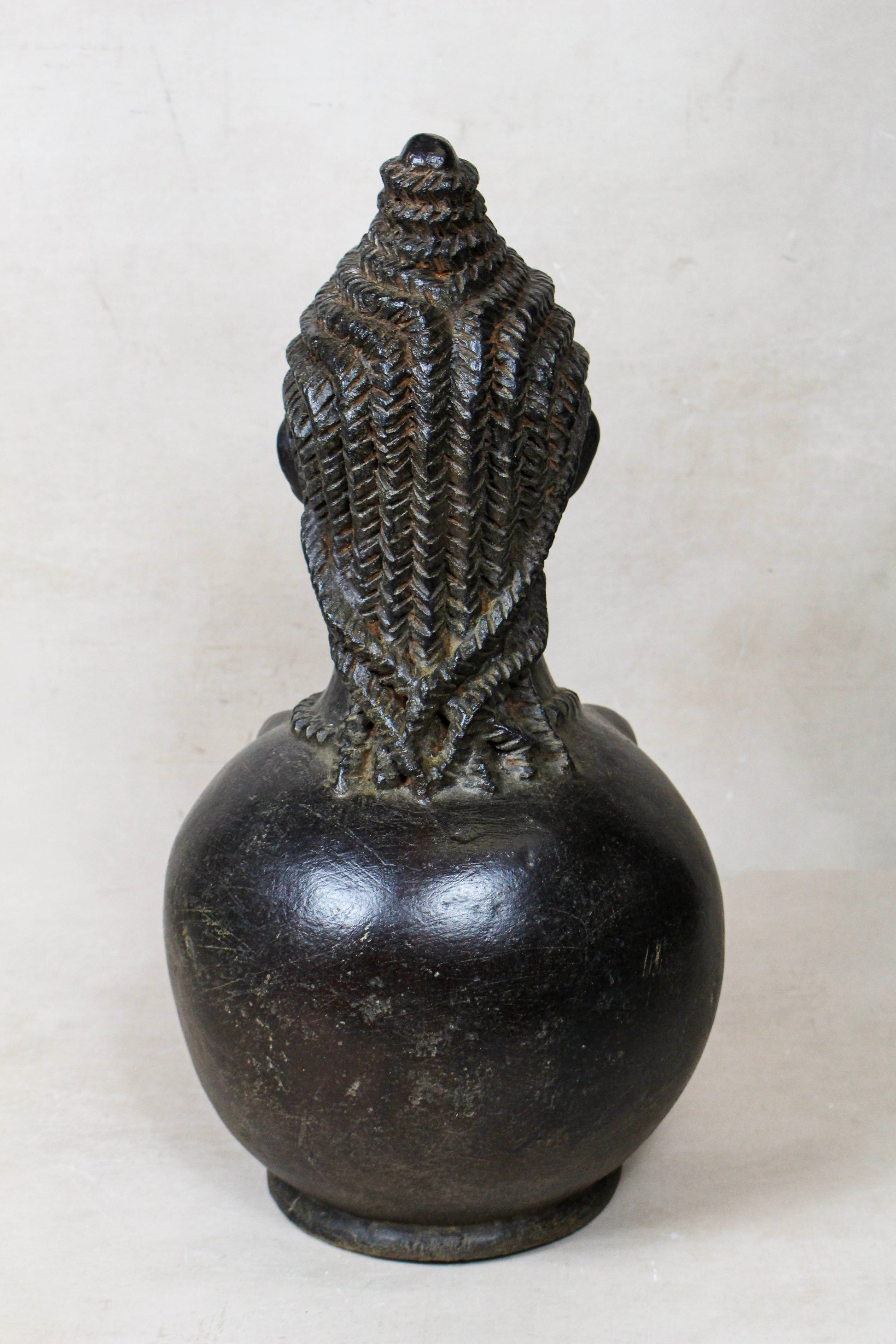 Material: Hand-burnished terracotta with a deep, obsidian-like patina.