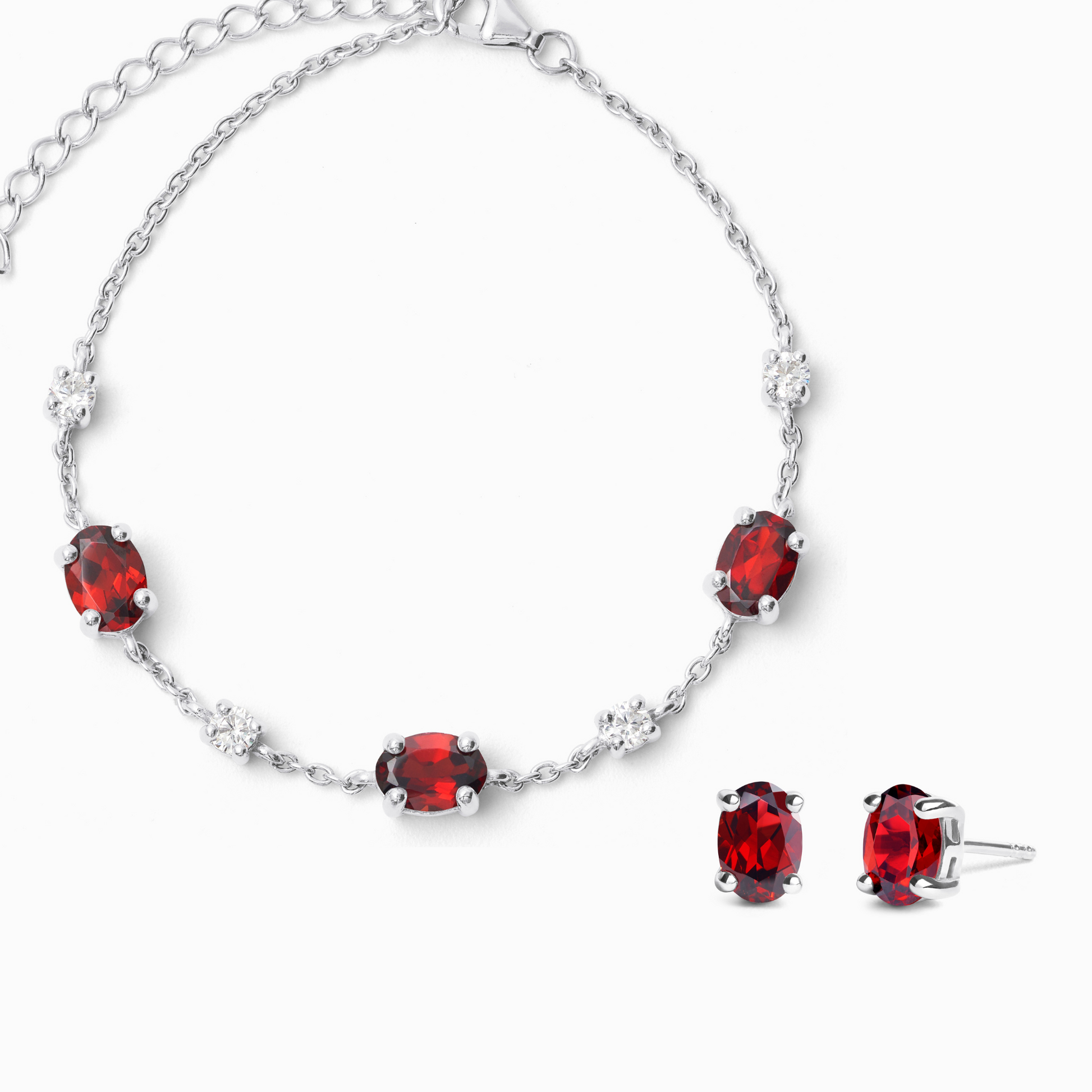 The perfect starter set for red gemstone lovers, this jewellery set comprises a bracelet and a pair of matching stud earrings. Each piece has been meticulously handcrafted with garnet - the deep red gemstone. The bracelet is also adorned with sparkly simulated diamonds. This jewellery set will make an ideal Christmas gift, birthday gift and anniversary gift for your loved ones.