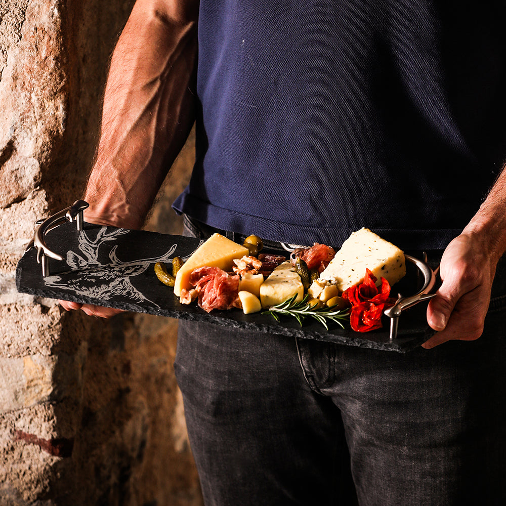 Add a touch of nature-inspired elegance to your entertaining with our compact Small Slate Serving Tray, adorned with a graceful stag motif and classic antler handles. Perfect for serving small bites or displaying decorative items, this tray seamlessly blends practicality with timeless style.