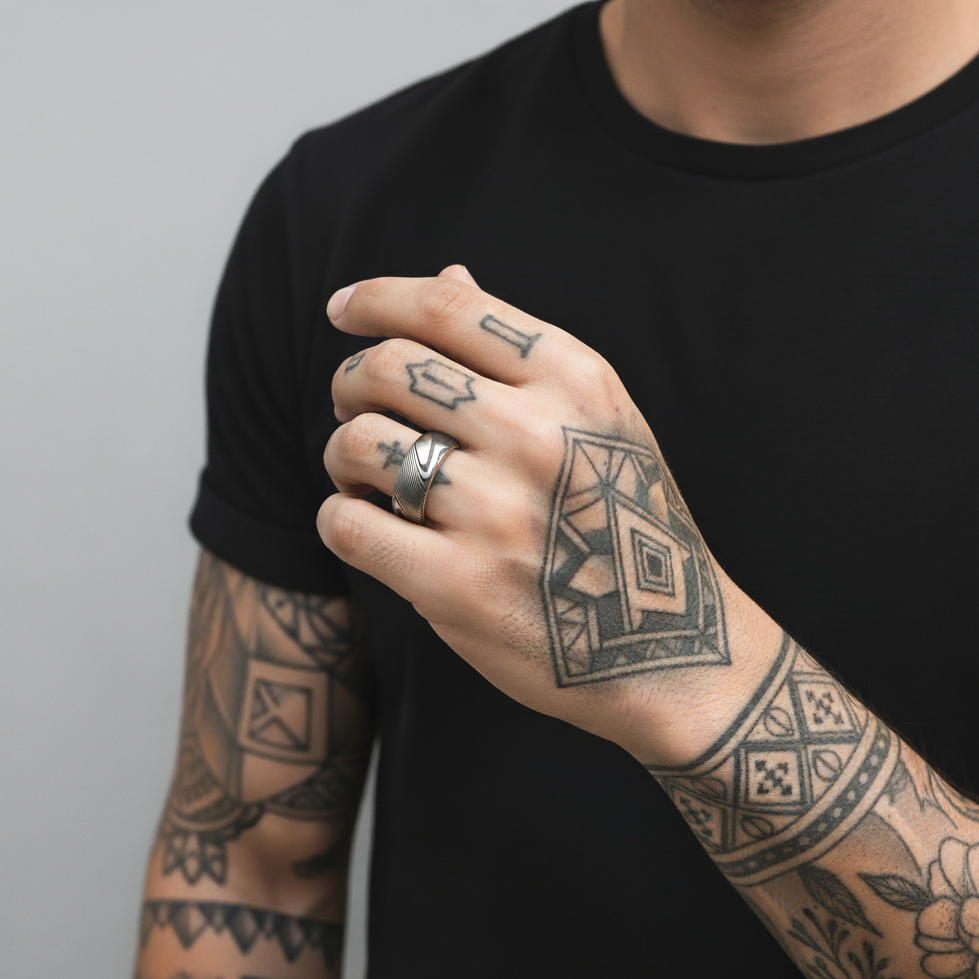 The Centaurus is a ring that speaks of strength, history, and individuality. Forged in Damascus steel, its swirling patterns echo the artistry of ancient blades, giving each band a unique, layered texture. At its heart lies a core of genuine oak whisky barrel, adding warmth, depth, and a story of tradition to the design.