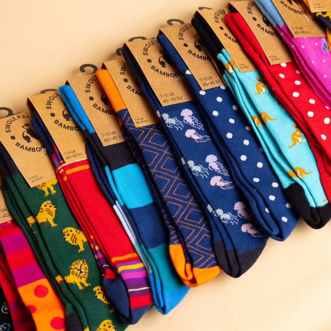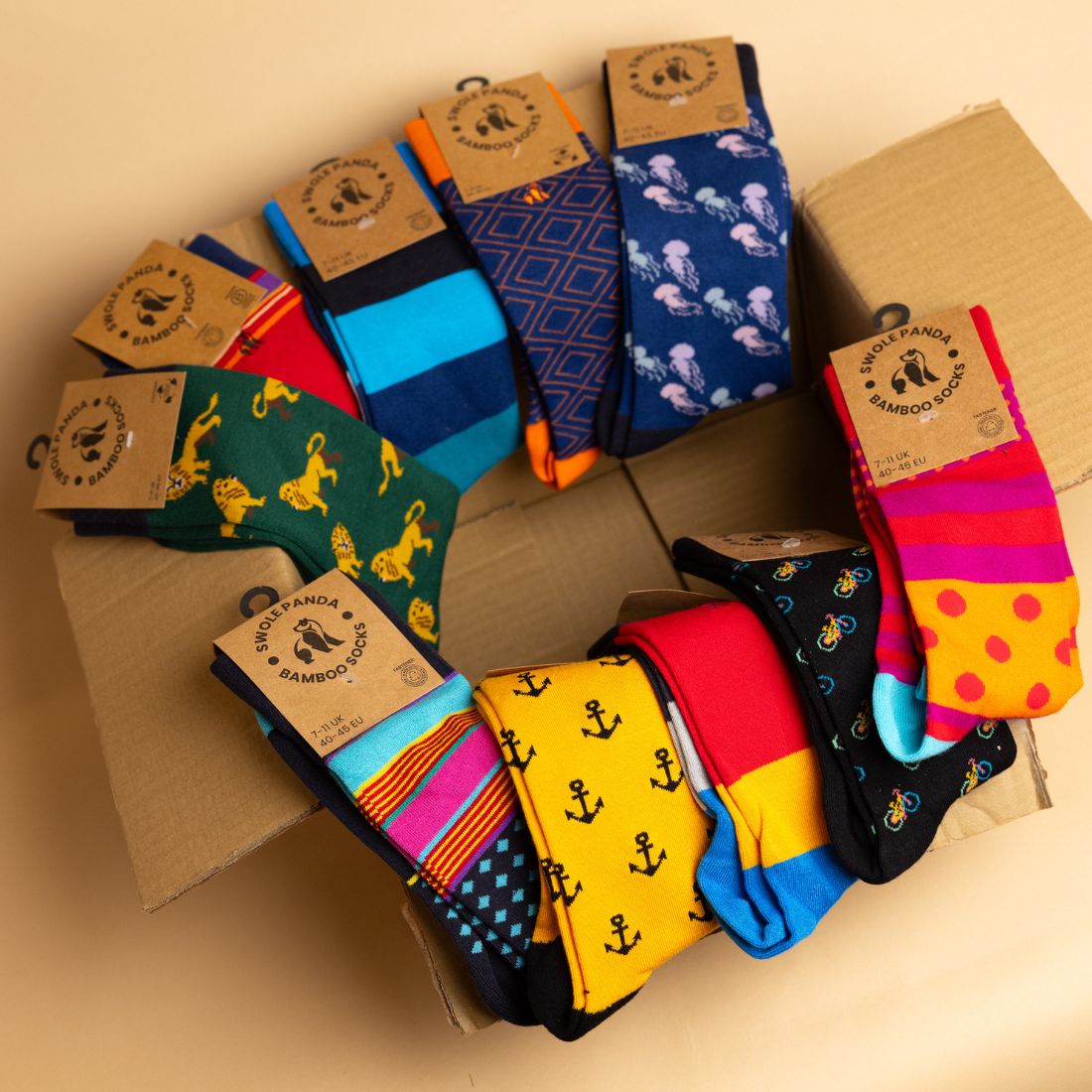 - Receive a mystery box filled with 10 or 20 pairs bamboo socks from Swole Panda. These socks are the same material, quality and size that you're used to. There are a few things to note: