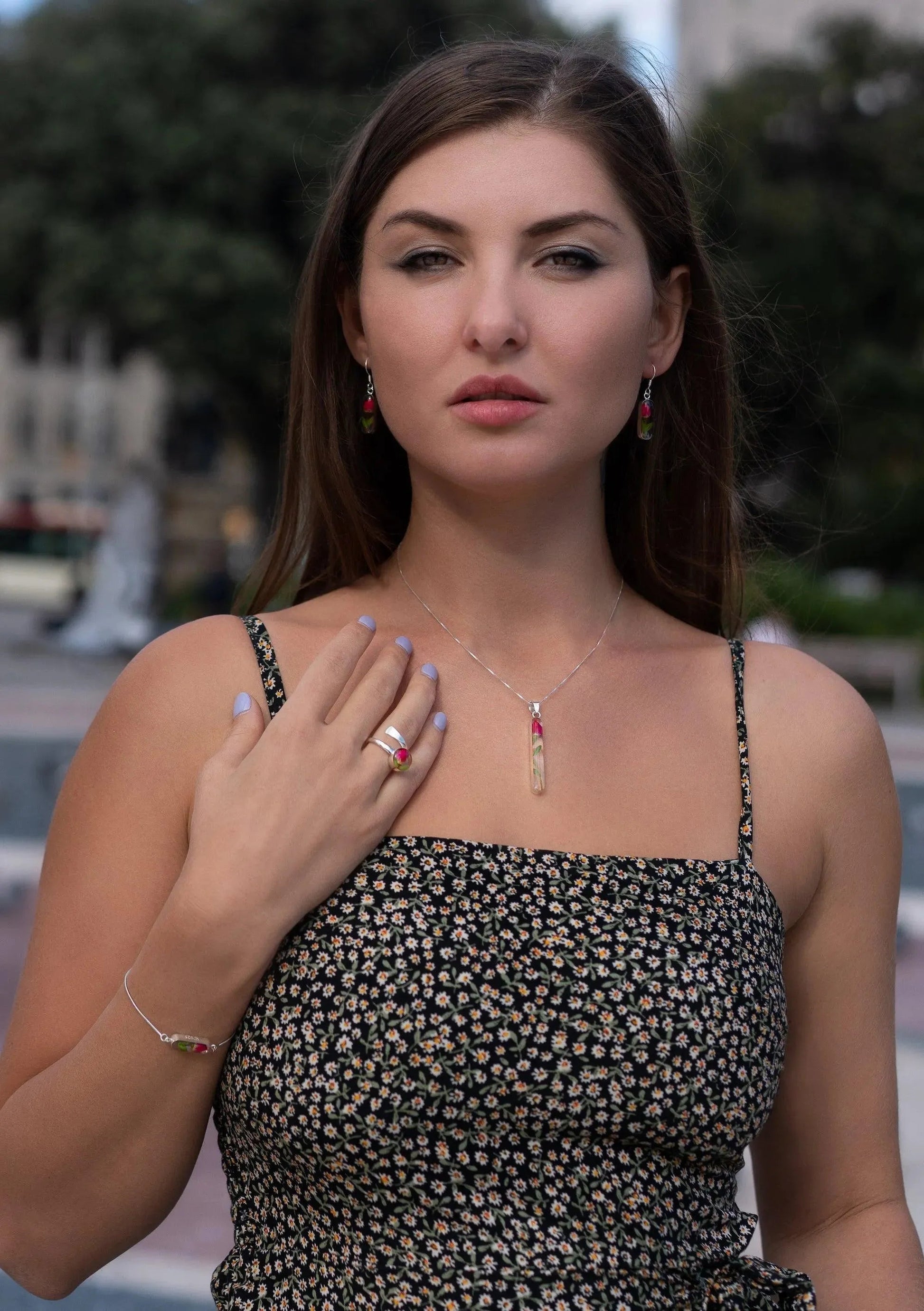 Celebrate nature’s poetry with this elegant Real Rosebud Bar Pendant Necklace. A genuine miniature rosebud—eternally linked to love, romance, and admiration—is delicately preserved in a sleek, elongated bar of resin and framed in gleaming sterling silver. Its graceful silhouette is perfect for layering or wearing solo as a statement of heartfelt sentiment. Handmade with real flowers by Shrieking Violet®, this necklace arrives beautifully presented, making it an unforgettable gift for Valentine’s Day, anniversaries, or anyone who loves meaningful jewellery.