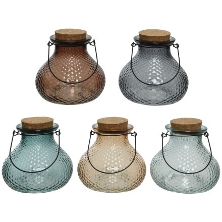A beautiful assortment of beige and blue hue glass wasp catcher bottles. Each bottle features a cork stopper and a black iron handle for easy carrying, while the honeycomb textured finish on the glass adds a unique touch.