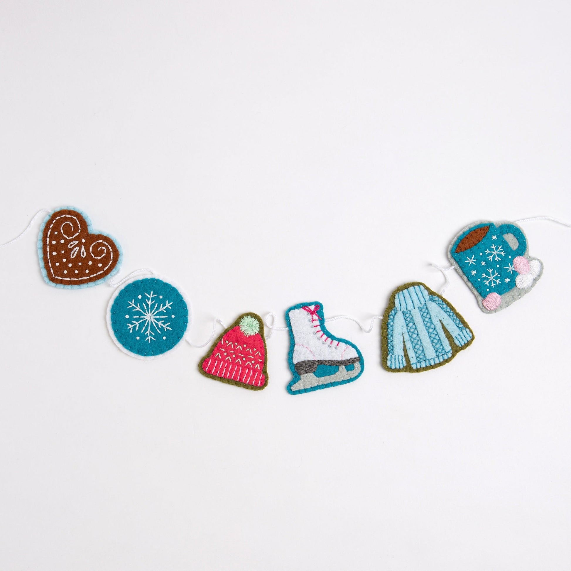 Embrace the magic of winter with this charming felt garland kit, celebrating all the season’s cosy delights! From steaming hot chocolates to swift ice skates and snuggly knitwear, each piece captures the essence of crisp, frosty days. Crafted with our soft wool-blend felt and DMC threads, the kit comes with clear, step-by-step instructions to guide you.